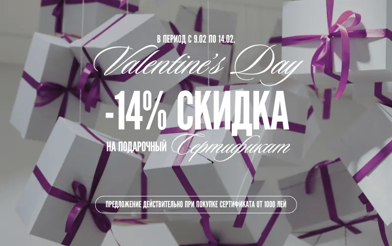 ❤VALENTINE’S DAY - 14% Скидка на Подарочный сертификат (акция действует при покупке сертификата от 1000 лей)